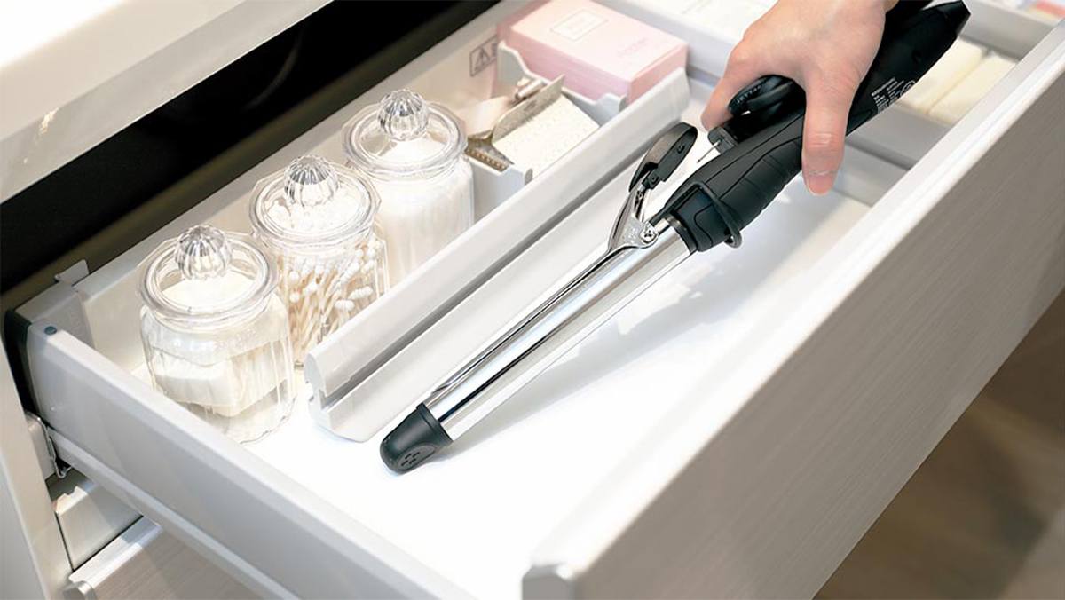 橱柜内部的收纳空间也使用耐高温的珐琅材料,因此即使是高温的烫发器也可以马上收纳。这样就省去了冷却的时间和麻烦。