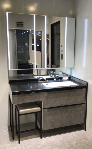 ドレッサータイプの洗面化粧台は、クォーツストーンカウンターと照明埋め込み型のフェイスクリアミラーで高級感のあるユーティリティ空間を演出します。ボウルが片寄となり、メイクの時に利用するのはもちろん、ユーティリティでのちょっとした作業スペースにもなります。