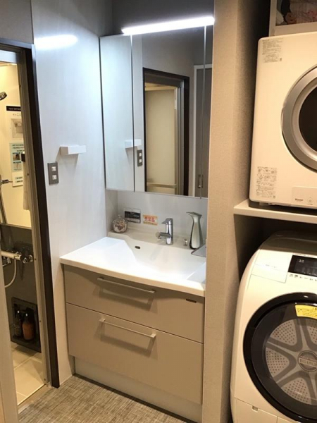 サイズオーダーで壁とのスキマがなく、美しいぴったり仕上げ。元の収納スペースを確保できる、マンションリフォームにも最適な洗面化粧台。