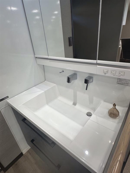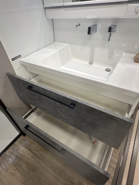 サイズオーダーで壁とのスキマがなく、美しいぴったり仕上げ。元の収納スペースを確保できる、マンションリフォームにも最適な洗面化粧台。