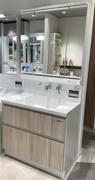 二段のスライド収納と3面鏡で、収納力抜群の洗面化粧台です。