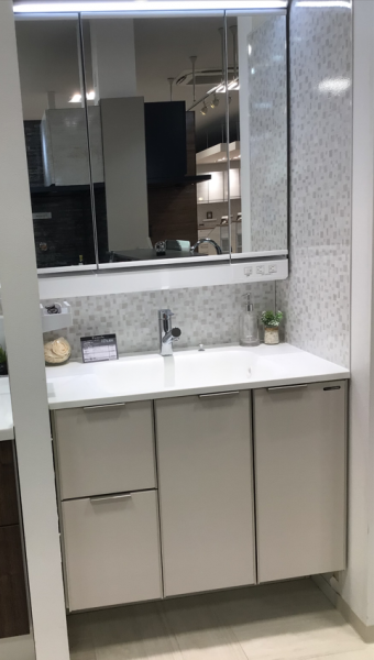 一体型フラットカウンターにワイド3面鏡、間口900でこの価格。ホーローミラーパネルとホーローサイドパネルはモザイク柄で「ほっこりした雰囲気の洗面台」です。
