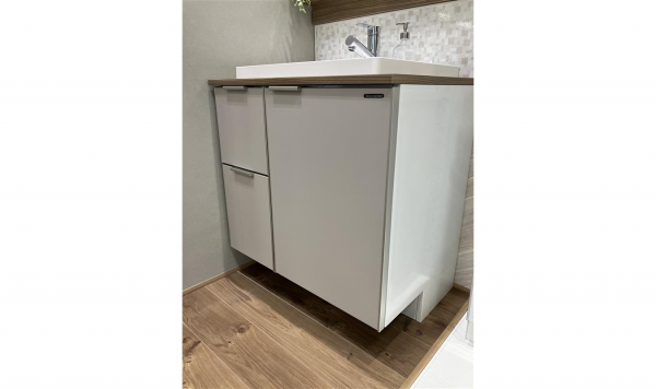サイズオーダーで壁とのスキマがなく、美しいぴったり仕上げ。元の収納スペースを確保できる、マンションリフォームにも最適な洗面化粧台。
