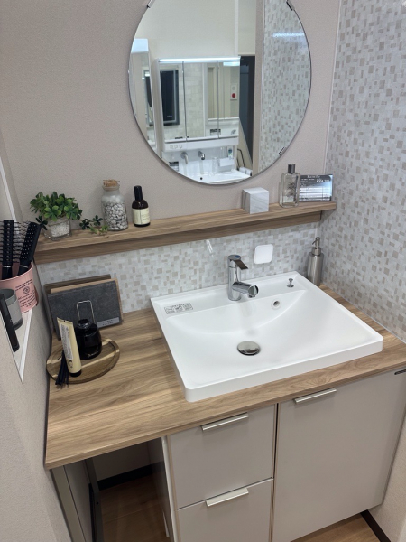 サイズオーダーで壁とのスキマがなく、美しいぴったり仕上げ。元の収納スペースを確保できる、マンションリフォームにも最適な洗面化粧台。
