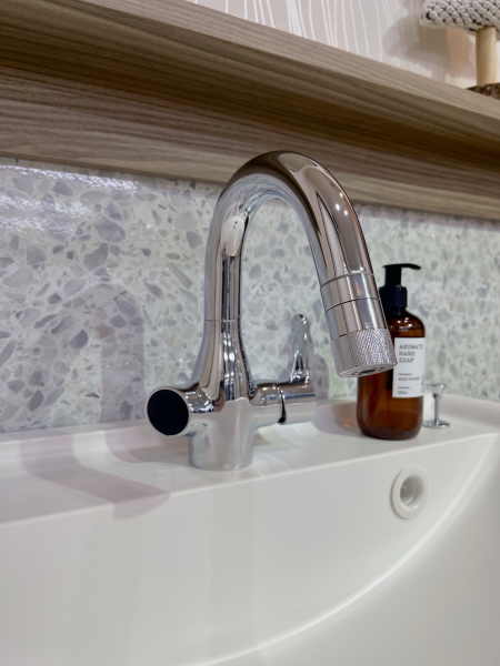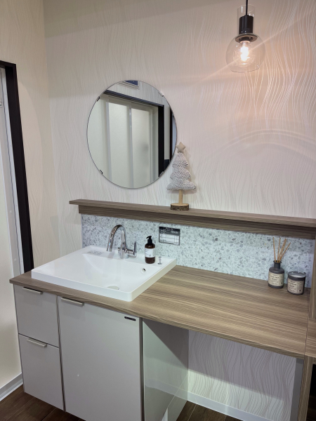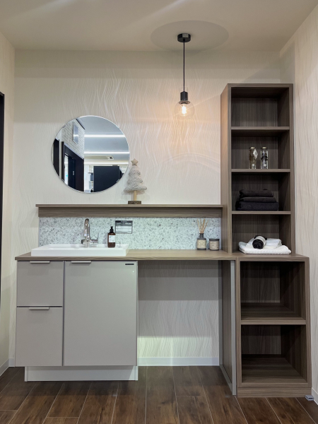 メラミンカウンターと造作棚(別途)を合わせることで理想の洗面空間を実現します♪