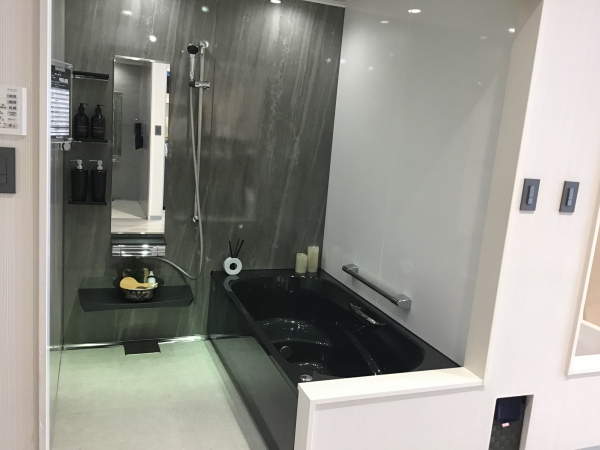人気の壁パネルカラー:ジオマーブルモスグレーとシュガーブラック浴槽の展示です!