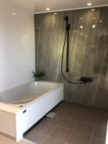 お子様とのご入浴も余裕のあるワイド浴槽にスタイリッシュなブラック水栓でトレンド感のある展示です。