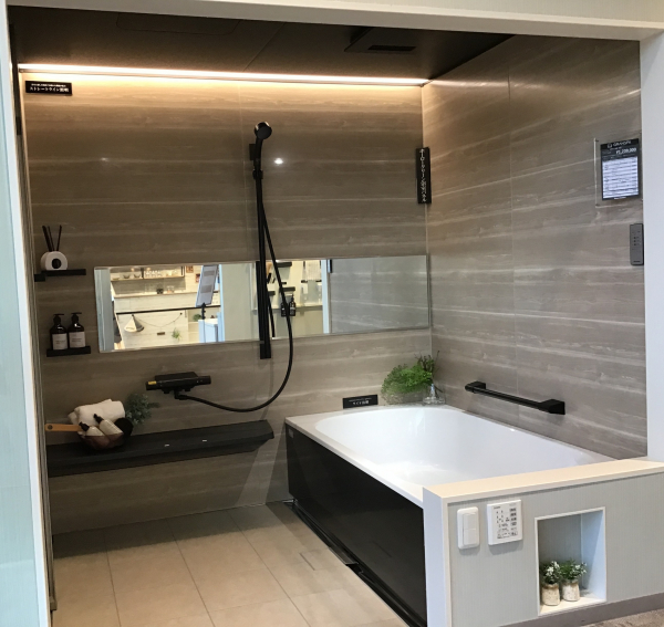 皆様憧れの洗い場広々1.25坪の展示です。ワイド浴槽でゆったりリラックスも出来ます。