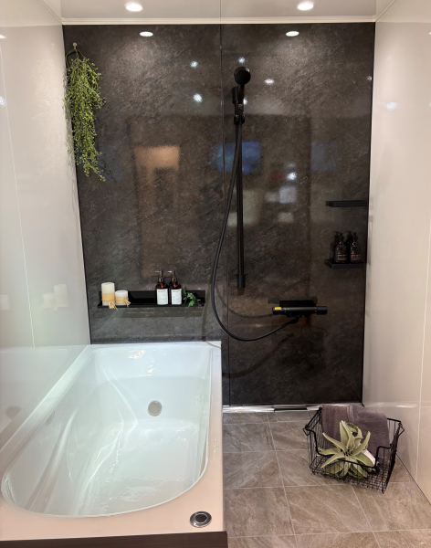 高級感のある「ビンテージアイアン」の壁に、新ブラック小物で更にかっこいい浴室空間に…!