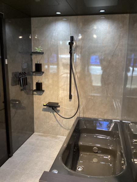 天井や浴槽・ドアをブラックでシックにまとめ高級感のあるバスタイムを味わえる仕様です!照明も調光調色付きでいろんなシーンでお楽しみいただけます!