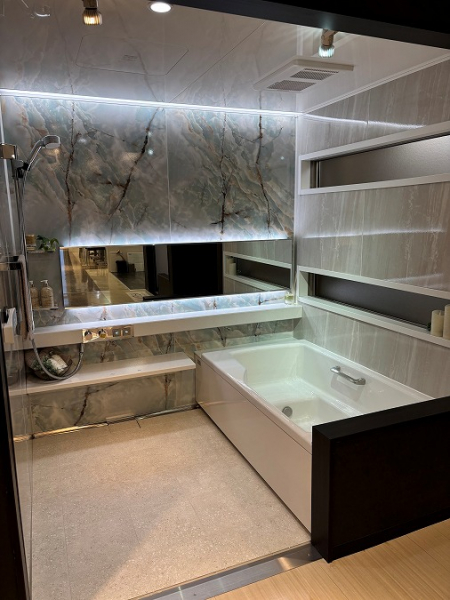 美しい大理石柄の壁パネルで明るく優雅な雰囲気のバスルームになりました。