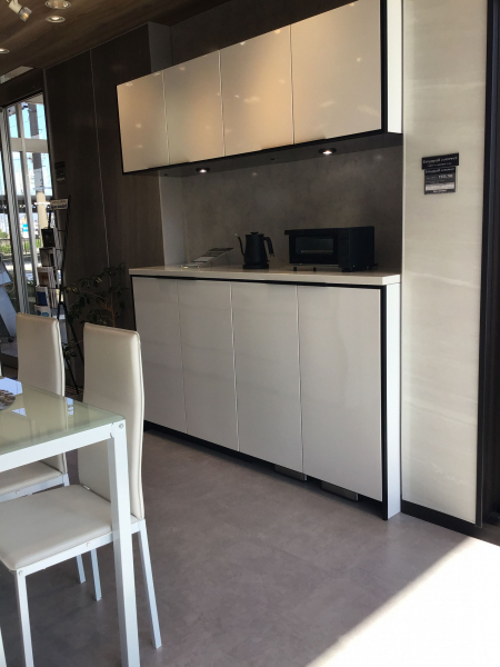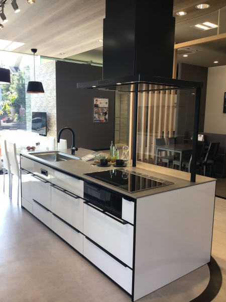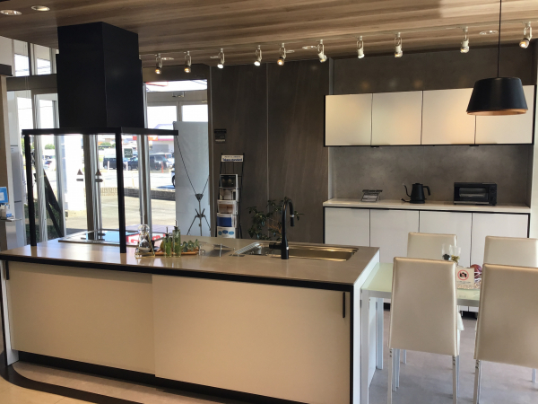 ホワイトの扉色にブラックのモールを合わせたシンプルなモノトーン展示に仕上げました。