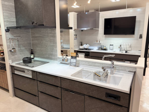 展示はコンロ下を90cmのキャビネットにアレンジし、フライパンやお鍋が多い方もしっかり収納できます♪
