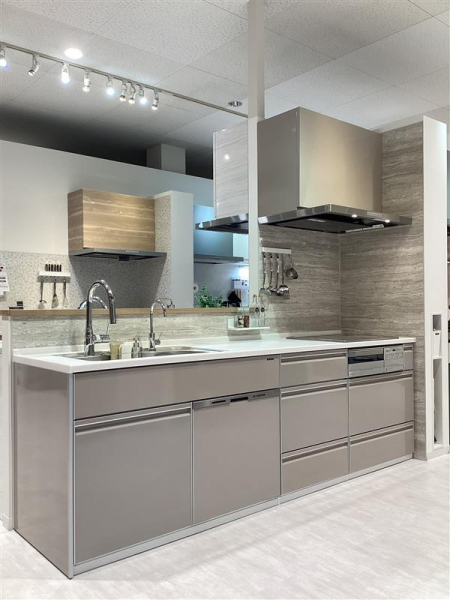 清掃性に優れた換気扇など、こだわりを詰め込んだあたたかな色味のキッチンです。