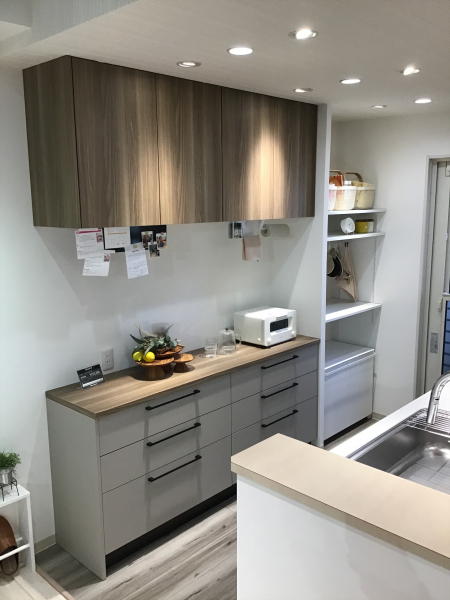 木製ながらキャビネットの底板はホーロー素材でお手入れのしやすさも兼ね備えた、ハイブリッドキッチン♪