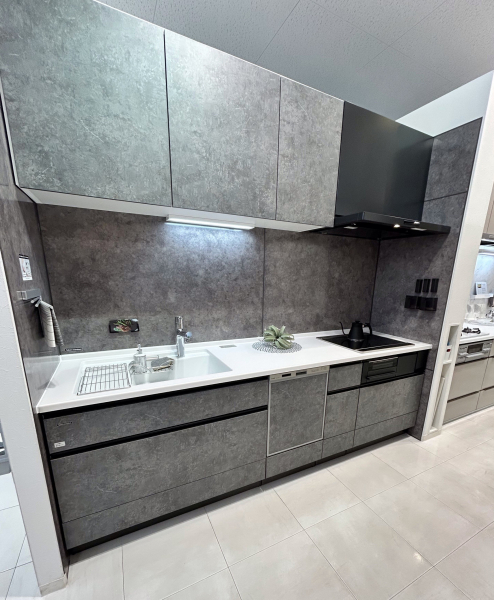今流行りのグレーの扉カラーに機器類も良く選ばれる深型食洗機と浄水器内蔵型水栓にした展示です♪