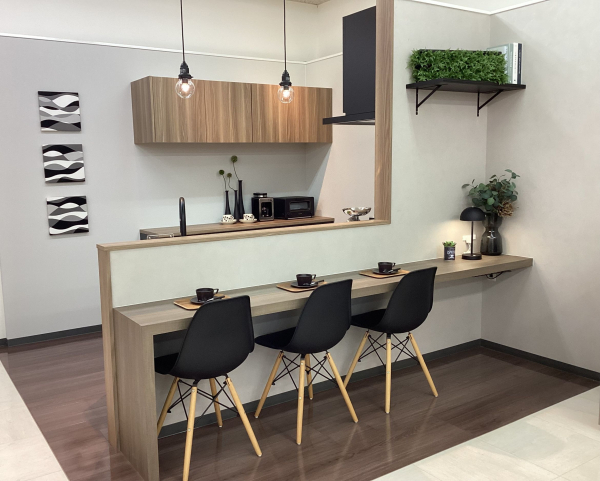 背面収納とトータルコーディネートしたおしゃれなキッチンです。