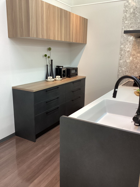 背面収納とトータルコーディネートしたおしゃれなキッチンです。