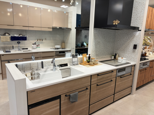 オシャレな”木目柄”、清掃性の良い”ホーローキャビ”、使い勝手の良い”家事らくシンク”でこだわり満載のキッチン♪