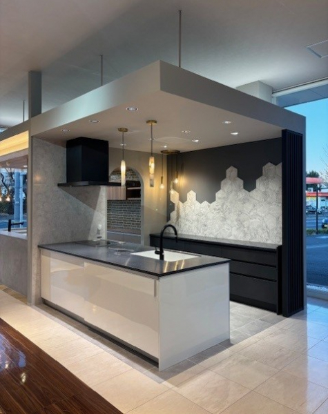 キッチン本体とカップボードで異なるシリーズ・カラーを採用した新展示!