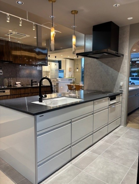 キッチン本体とカップボードで異なるシリーズ・カラーを採用した新展示!