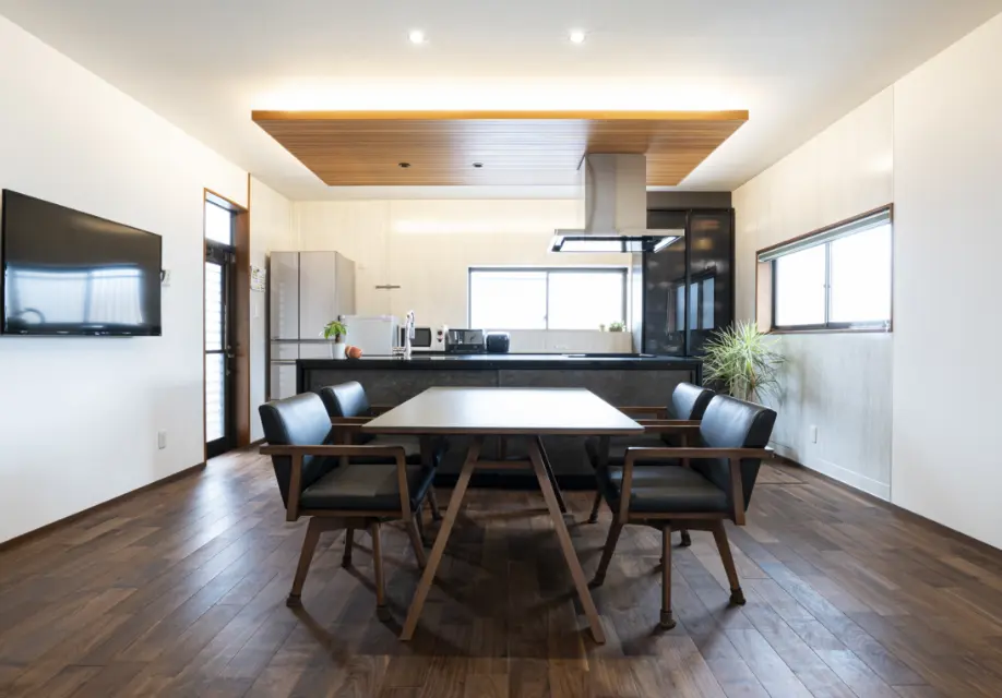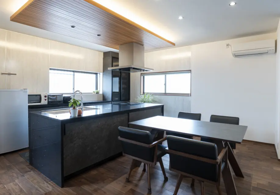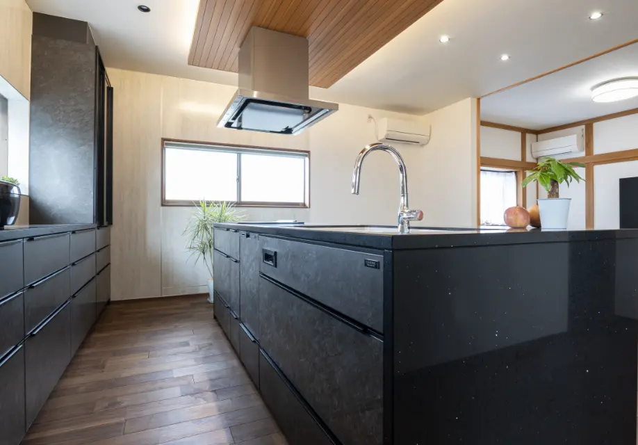 ショールームでみたコーディネートが、キッチンとダイニングテーブルの統一感があって素敵でした。天板のカラーはシックな黒。黒っていうと暗くなっちゃうイメージがあるのですが、この天板は照明があたるとキラキラと輝くように見えるんです。