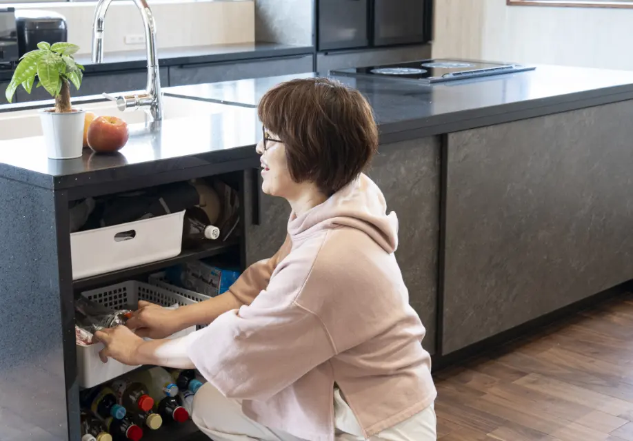 キッチンのキャビネットだけではなく、リビング側と背面収納にもたっぷりあります。全部片づけられるので、モノを見せないシンプルな空間にできました。「毎日使うものはここ」「大きいのと小さいのはここ」というふうに鍋や皿を使う場所にまとめてしまえたから、1カ所をパッと開けたら全部揃ってます。探すために歩き回ったり、高いところから取り出したりしなくて済むようになりました。