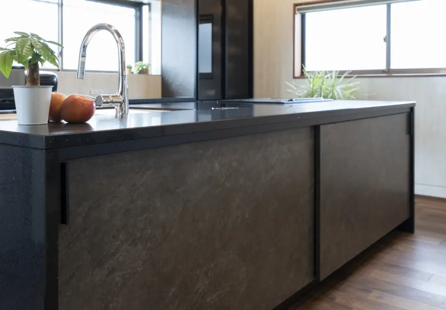 黒とグレーの落ち着いた組み合わせは重たく見えず、空間全体がすっきり引き締まって見えましたし、石目調の模様も自然な表情があって気に入りました。汚れも落ちやすいし、「これなら間違いない」と思えたのが決め手になったんです。