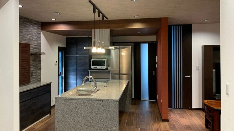 子供も巣立って、これから夫婦でゆったり過ごすことができるLDKにしたいと思い、リフォームを決意。お酒をゆっくり楽しめる『BAR』のような雰囲気にしたい!というリクエストの通り、ホテルのラウンジのような大人の雰囲気のキッチンスペースが実現しました。アイランドキッチンは家族が作業していても邪魔にならず、広々とした天板に作った料理や調理器具を置くことが出来る点や、使ったお皿もまとめて片付けることが出来て、とても気に入っています。