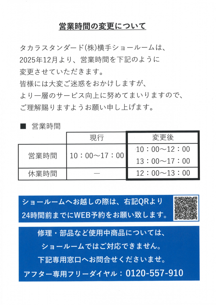 横手ショールームは、2025年12月より、12:00~13:00を休業時間とさせていただきます。