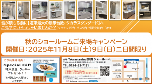 タカラ札幌中央ショールームにて、㈱キッチンワークス様主催による秋の水廻りリフォーム大相談会を開催致します。