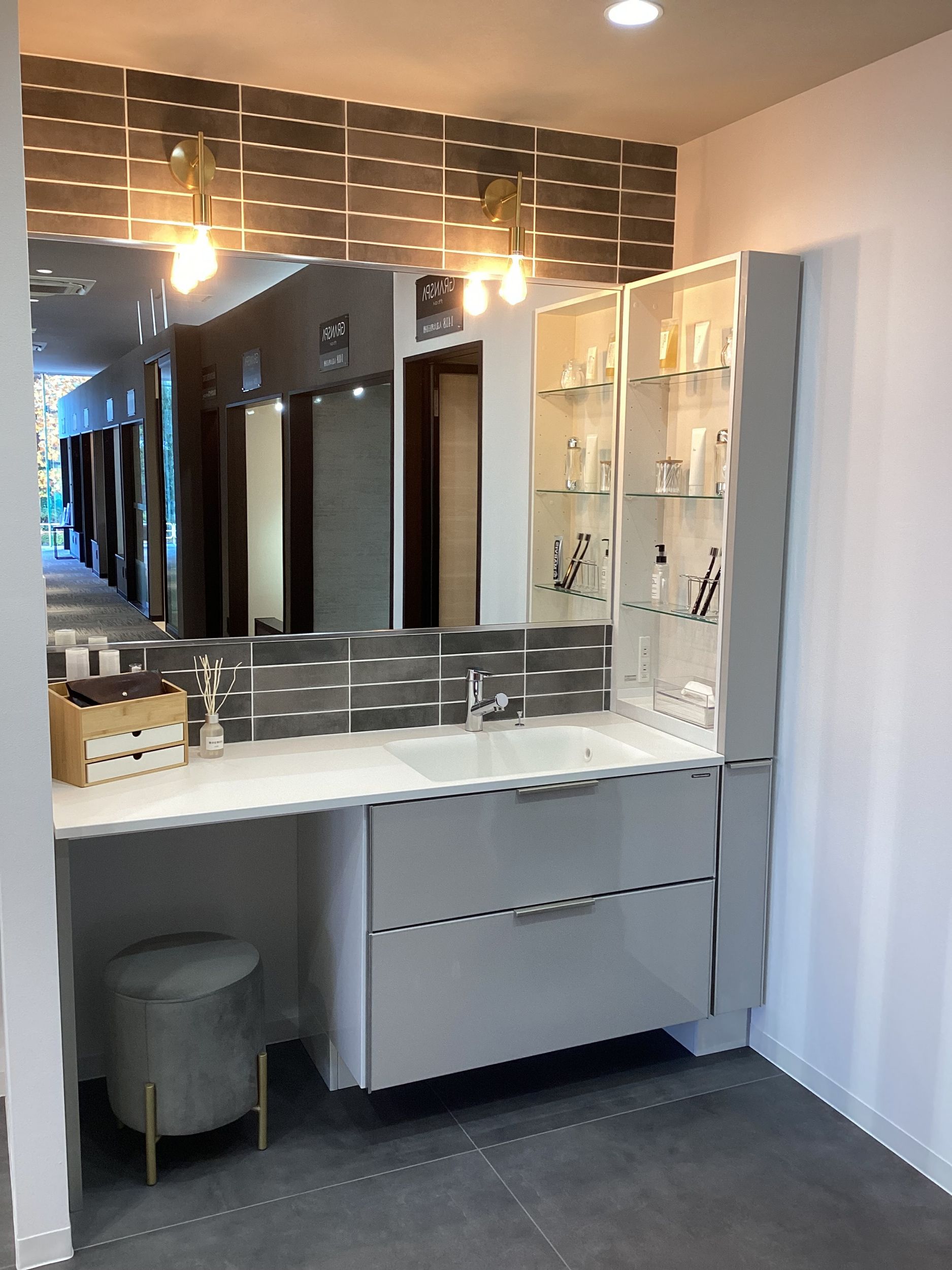 洗面化粧台も新しく設置され脱衣所とのつながりを体感できる展示となっております!